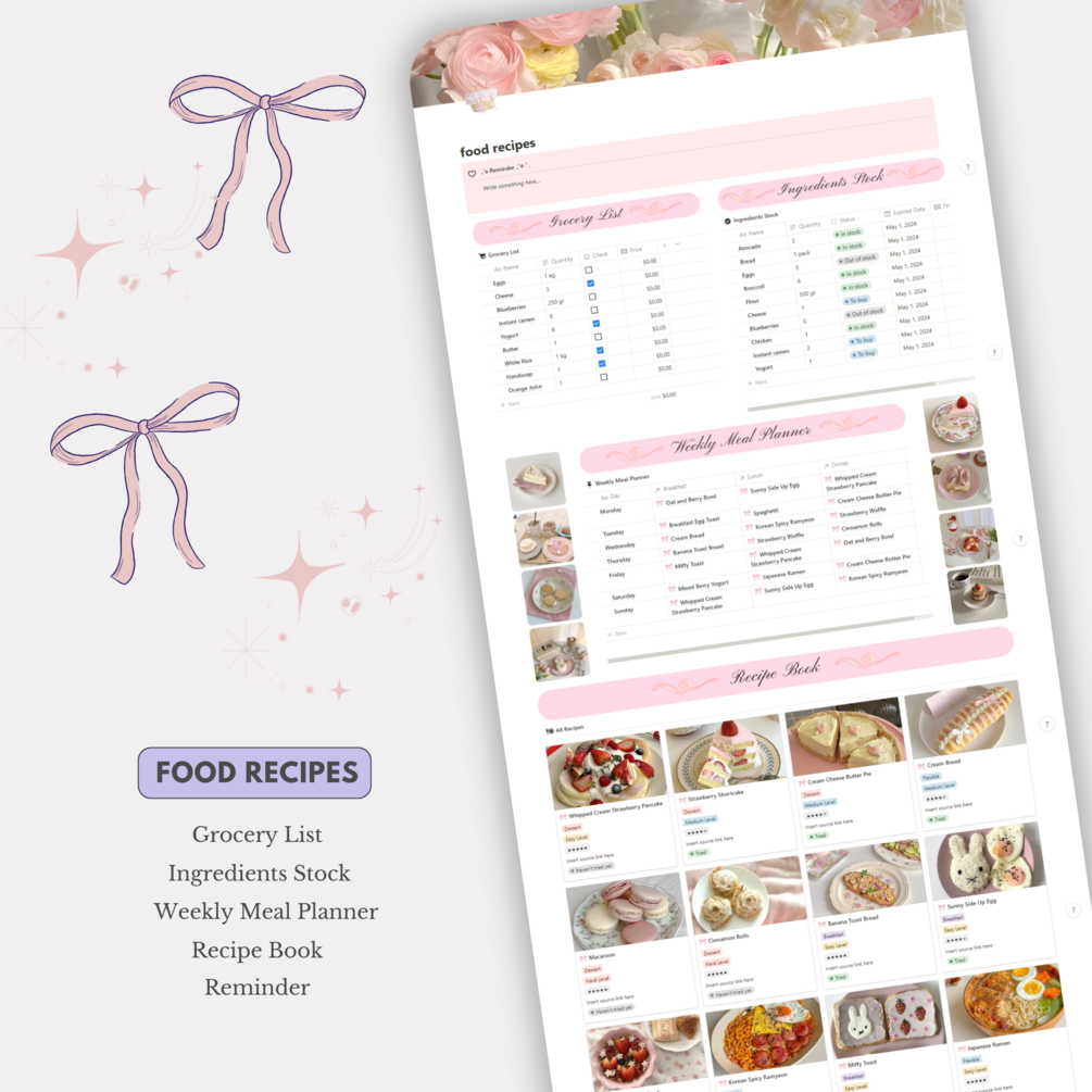 🎀 Food Recipes: Grocery List, Ingredients Stock, Weekly Meal Planner, Recipe Book, Reminder