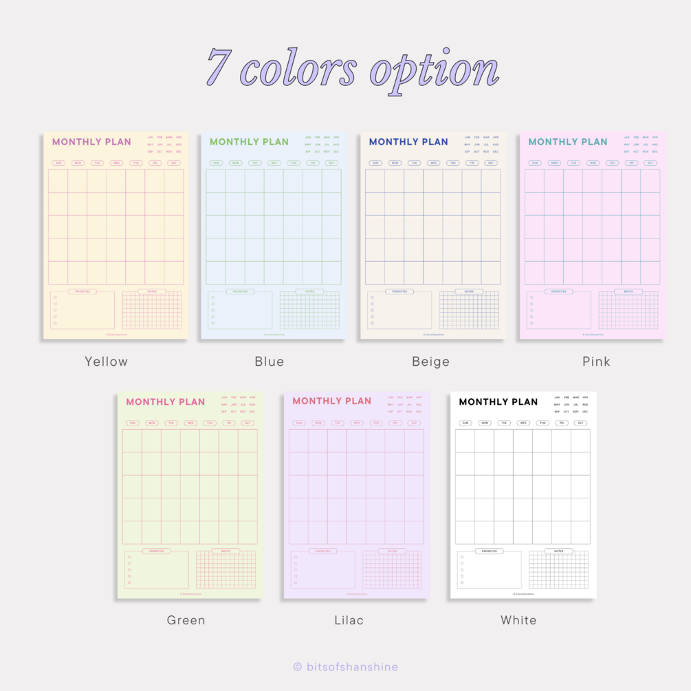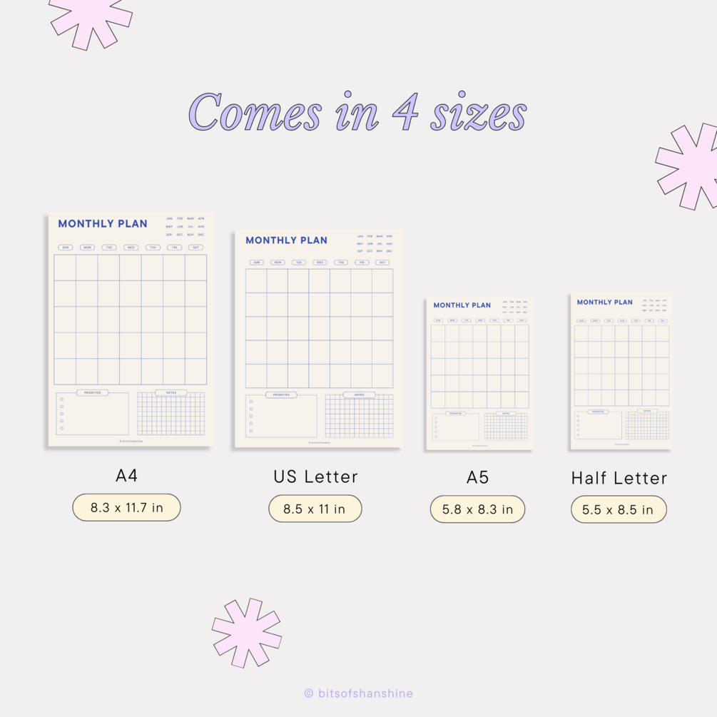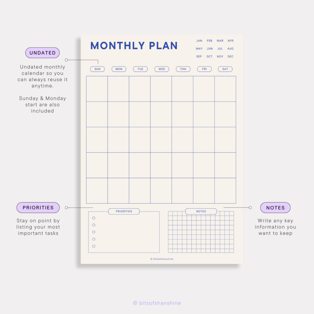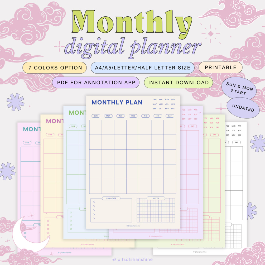 You can write down any plan, set your priorities, and write any key information. It’s an undated planner, so you can always re-use it anytime. Psh, Sunday & Monday start are also included! It’s a digital planner, but also works great to print out as you need!