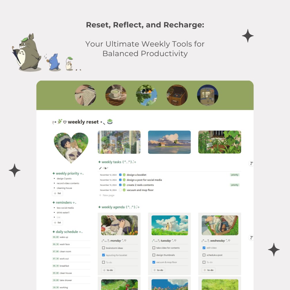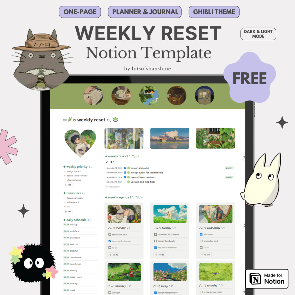 Imagine ending each week with a sense of accomplishment and beginning each new one with clear intentions. The Weekly Reset Notion Template is your go-to guide to break down weekly goals, prioritize tasks, and reflect on your journey.