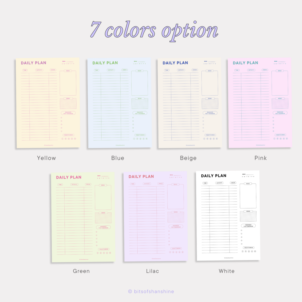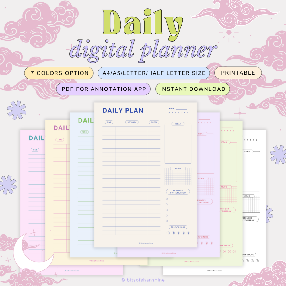 The minimalist & soft pastel colors Daily Digital Planner is here to make you more organized in your daily routine. Whether you're managing work projects, organizing personal goals, or juggling a busy lifestyle, our Daily Digital Planner is your go-to solution for staying organized, focused, and on track everyday. You can write down any ideas, time schedule, reminder, even mood tracker. It’s a digital planner, but also works great to print out as you need!